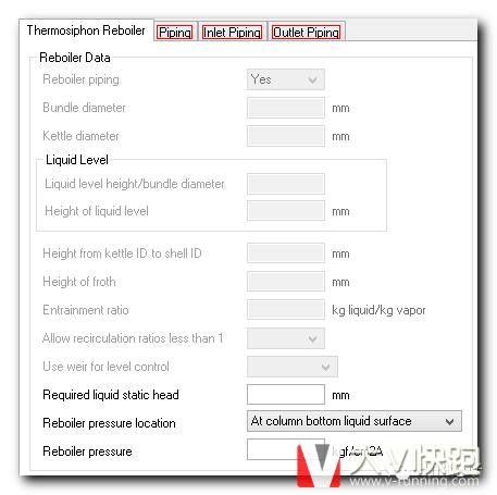 (1) Reboiler piping – 再沸器配管,对于虹吸式再沸器,默认为Yes,即需要输入配管信息来计算静压头和安装高度。对于釜式再沸器、降膜蒸发器则默认不需要,当然可以Yes来输入。文章源自云智设计-https://www.cidrg.com/cid-college/tutorial/htri/1740.html