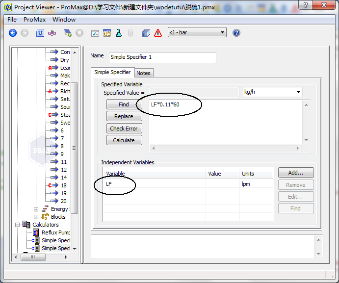 例如,胺液脱硫工艺中,贫液循环量与再生后贫液中酸气的含量有关,而贫液的酸气负荷取决于再沸器提供的能量负荷,该热量又与间接加热的饱和蒸汽量 有直接关系,所以饱和蒸汽量与贫液循环量有关。当前我们给定贫液循环量时, 所以可以通过添加 Specifier 来计算饱和蒸汽用量。假定蒸汽量与贫液量的关系为0.11kg(蒸汽)/L(贫液)。步骤如下:文章源自云智设计-https://www.cidrg.com/cid-college/tutorial/promax/1266.html
